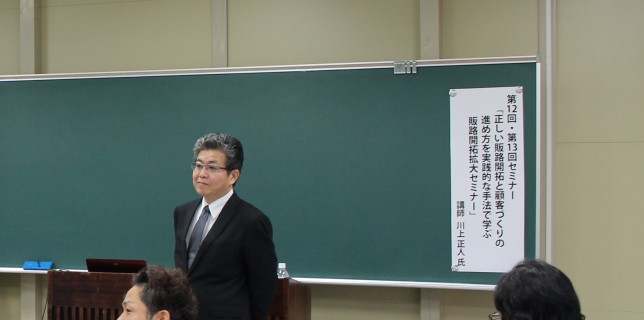 2015年1月11日・12日に「正しい販路開拓と顧客づくりの進め方を実践的な手法で学ぶ販路開拓拡大セミナー」が開催されました。 講師には、川上正人先生をお招きしました。 津田先生にもフォローに入っていただきました。 2日 続きを読む 事業報告 第12回・13回セミナー「正しい販路開拓と顧客づくりの進め方を実践的な手法で学ぶ販路開拓拡大セミナー」